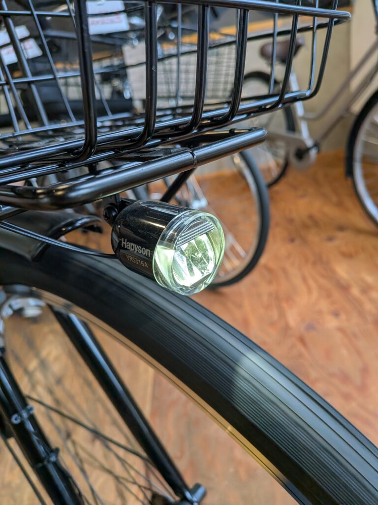 通学に使われるならほぼ必須級の装備です。しっかり明るく、つけ忘れることもなく、断線したりホイールの軸の発電機が壊れでもしない限りは半永久的に使えちゃいます。ちなみにしっかりLEDのライトです。