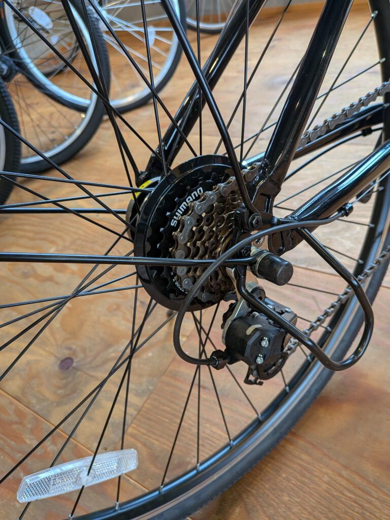 こちらは車体がアルミでできていて、さらにはフロントフォークまでもがアルミのフルアルミフレームになっております。このての自転車はアルミではなく鉄の自転車が多かったりアルミでもフロントフォークは鉄がほとんどなところをしっかりとフルアルミフレームになっています。(大切なことなので二回言いました!)これによりシティサイクルより軽くなって走るとスポーツ自転車らしい軽快な乗り味があります。あとアルミだと鉄と比べて少し錆びにくくなるのも嬉しいポイントです。ちなみにギアもしっかりと7段変速の物がついているので大抵の坂道はちゃらへっちゃらです。