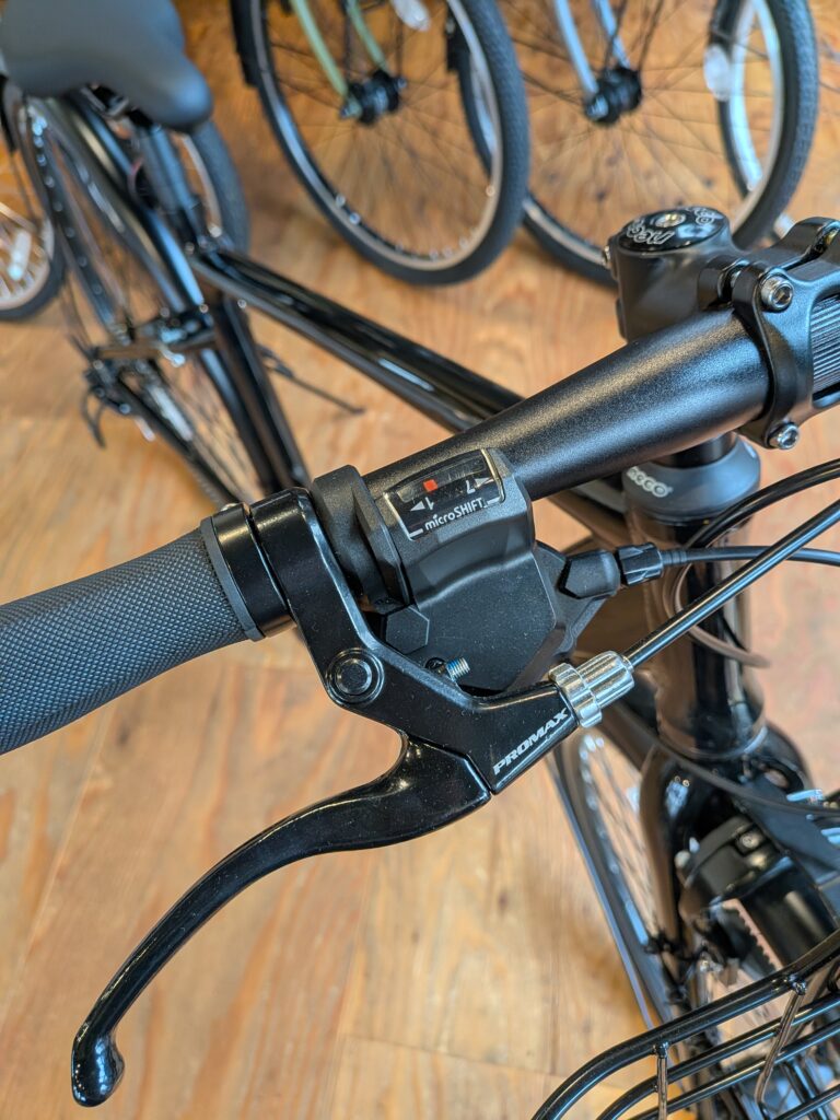 こちらは車体がアルミでできていて、さらにはフロントフォークまでもがアルミのフルアルミフレームになっております。このての自転車はアルミではなく鉄の自転車が多かったりアルミでもフロントフォークは鉄がほとんどなところをしっかりとフルアルミフレームになっています。(大切なことなので二回言いました!)これによりシティサイクルより軽くなって走るとスポーツ自転車らしい軽快な乗り味があります。あとアルミだと鉄と比べて少し錆びにくくなるのも嬉しいポイントです。ちなみにギアもしっかりと7段変速の物がついているので大抵の坂道はちゃらへっちゃらです。