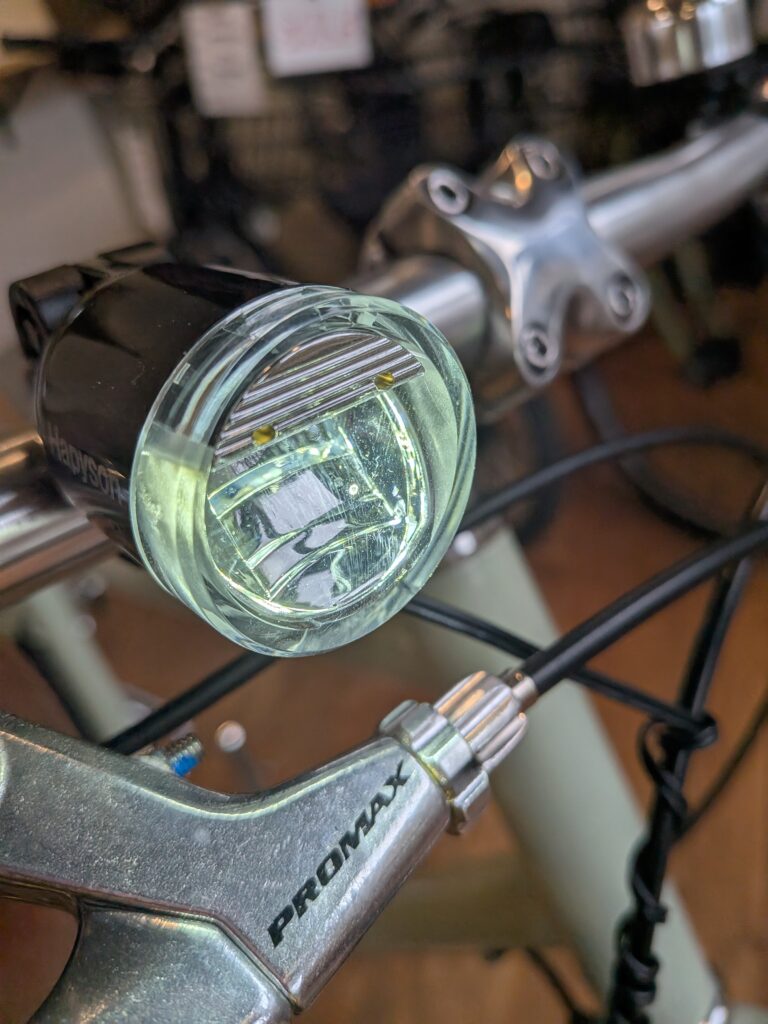 通学に使われるならほぼ必須級の装備です。しっかり明るく、つけ忘れることもなく、断線したりホイールの軸の発電機が壊れでもしない限りは半永久的に使えちゃいます。ちなみにしっかりLEDのライトです。